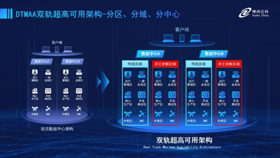 為幫助金融客戶更好地應(yīng)對數(shù)字經(jīng)濟(jì)時代對可持續(xù)性的高要求,實(shí)現(xiàn)“信創(chuàng)”與“數(shù)字化”齊頭并進(jìn),leyu.樂魚推出了雙軌超高可用架構(gòu)。該架構(gòu)在雙活數(shù)據(jù)中心的分區(qū)調(diào)度基礎(chǔ)上,增加信創(chuàng)域和非信創(chuàng)域的分域調(diào)度,實(shí)行信創(chuàng)域與傳統(tǒng)域應(yīng)用全量部署,使雙中心運(yùn)營變?yōu)殡p中心四區(qū)域并行運(yùn)行,互為多活,將“0到1”的單軌建設(shè)道路變?yōu)榉謪^(qū)分域協(xié)同的多活雙軌超高可用架構(gòu)。幫助客戶在新架構(gòu)下,保障“信創(chuàng)”的同時解決性能瓶頸,提升穩(wěn)定性,保證應(yīng)用可持續(xù)性,最終實(shí)現(xiàn)信創(chuàng)區(qū)域和非信創(chuàng)區(qū)域的平滑過渡,完成國產(chǎn)化替代目標(biāo)。